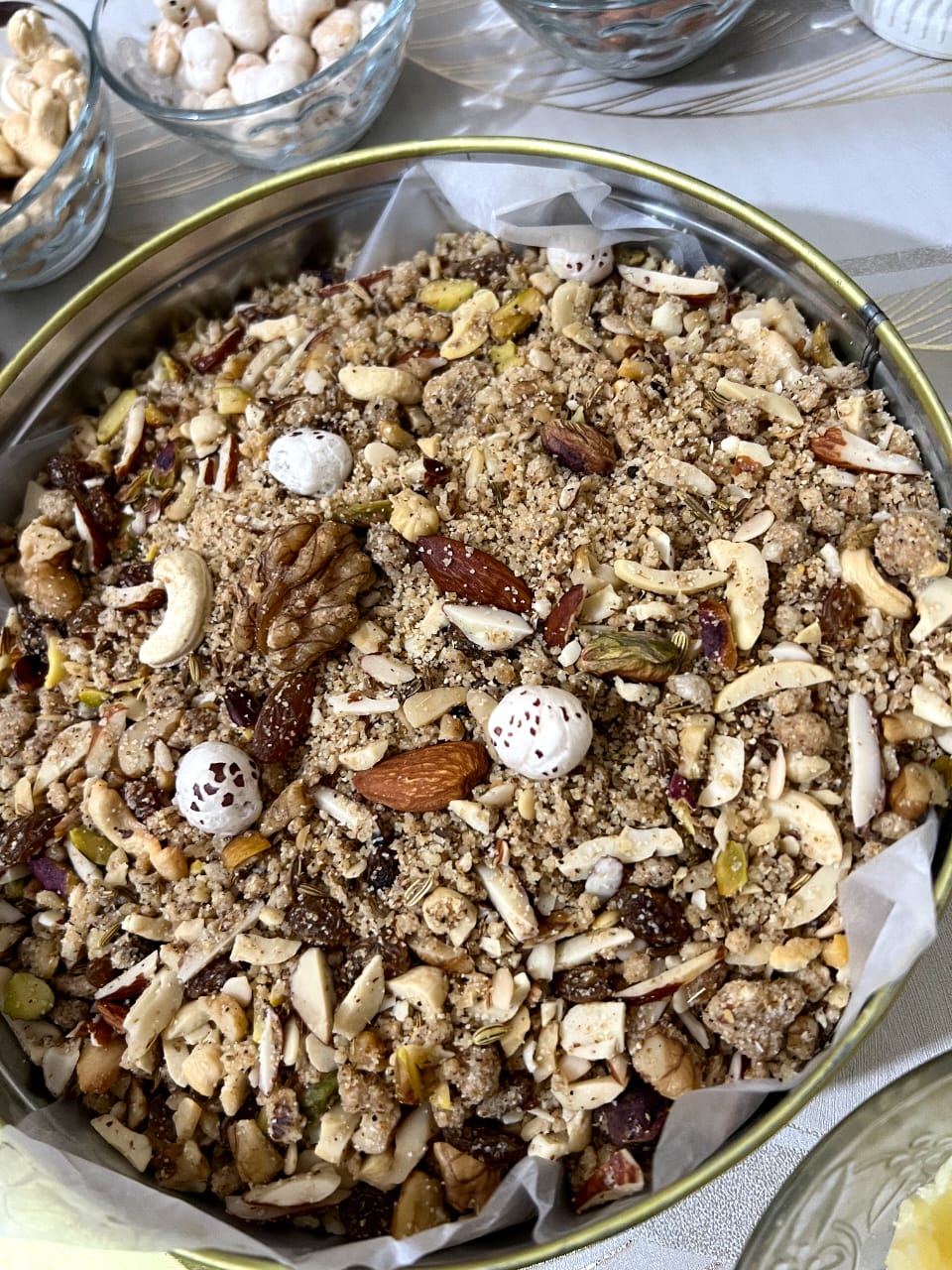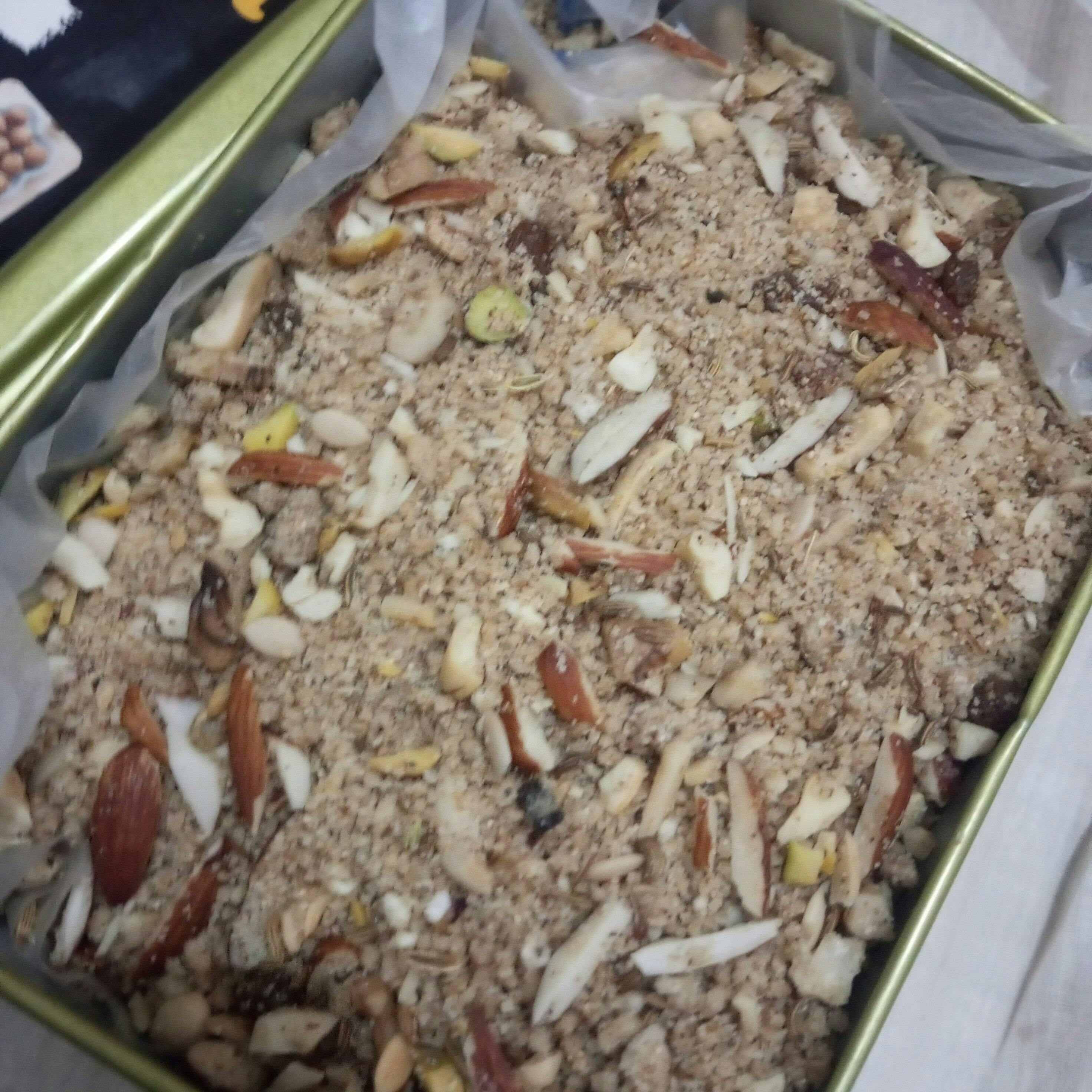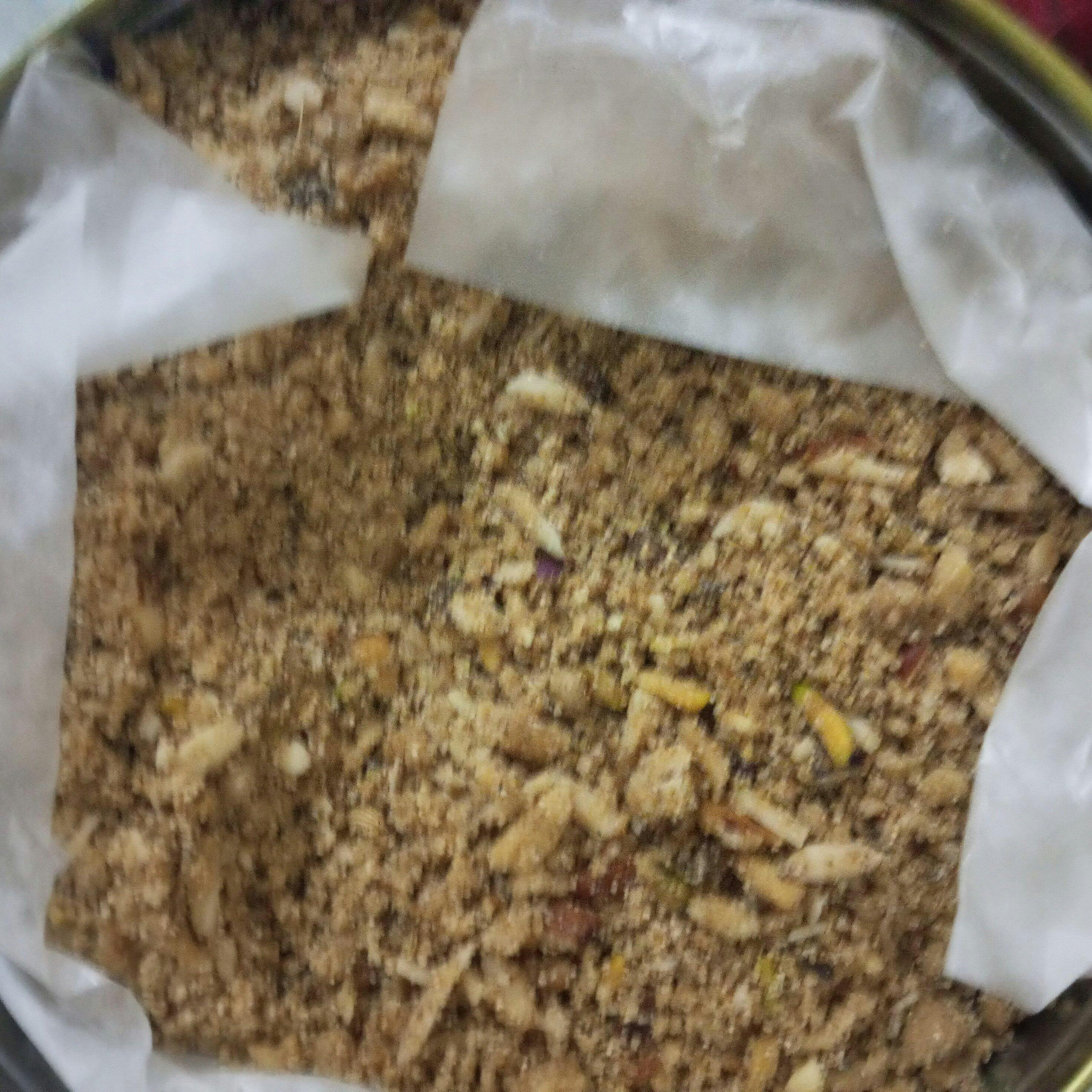 Semolina Flour, Pure Desi Ghee, Almonds, Pistachios, Walnuts, Sunflower Seeds, Melon Seeds, Edible Gum (gond), Jaggery, etc.